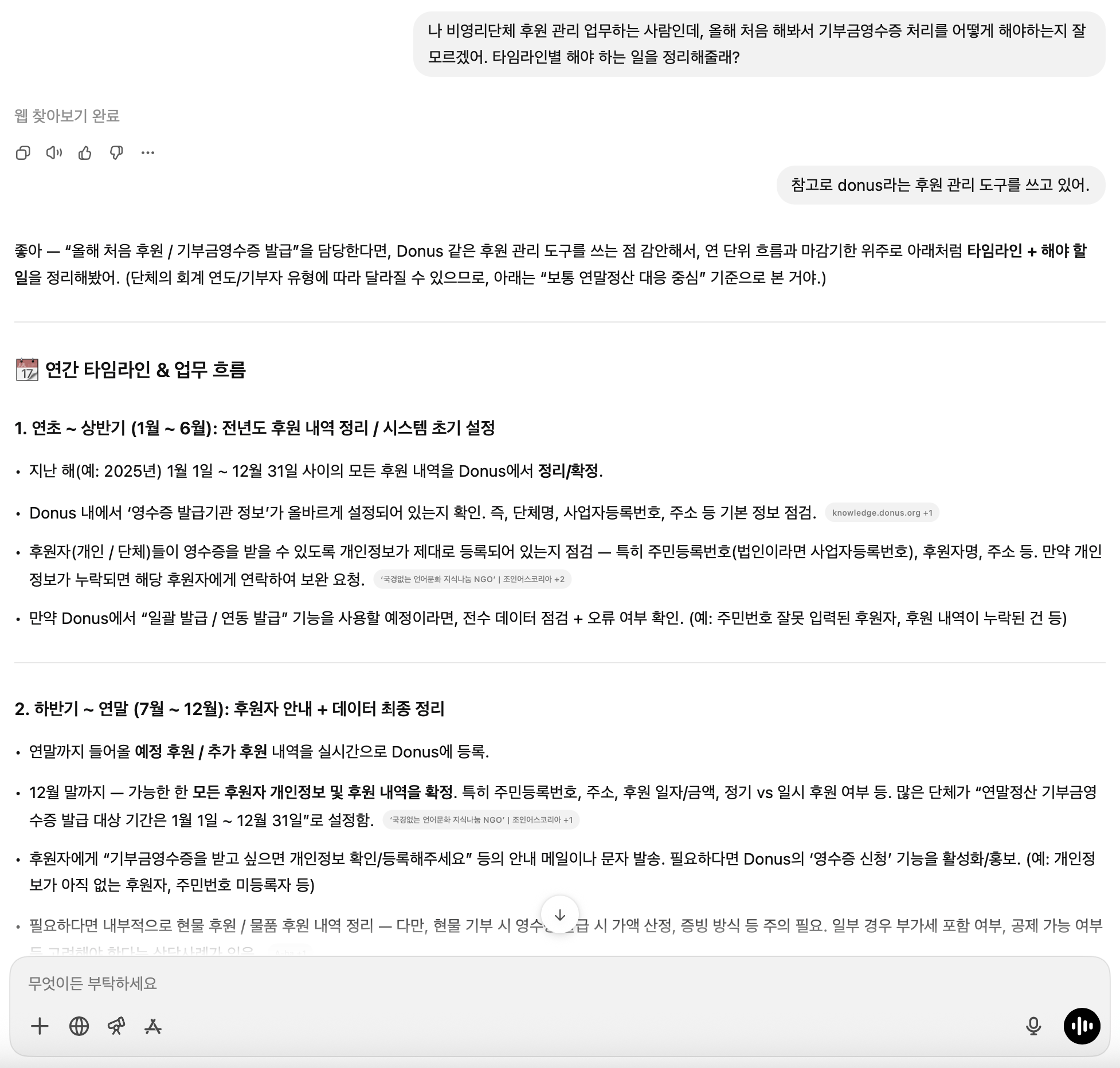 이런 저를 구원해준 것은, 끝을 모르고 뜨거워지고 있는 AI였습니다. 평소 직업이 개발자인 만큼 AI의 도움을 많이 받고 있었는데요. 아이가 부모한테 왜?라는 질문을 밑도 끝도 없이 던지는 것처럼, AI한테 후원 업무를 어떻게 해야 하는지 무작정 물어보기 시작했습니다.