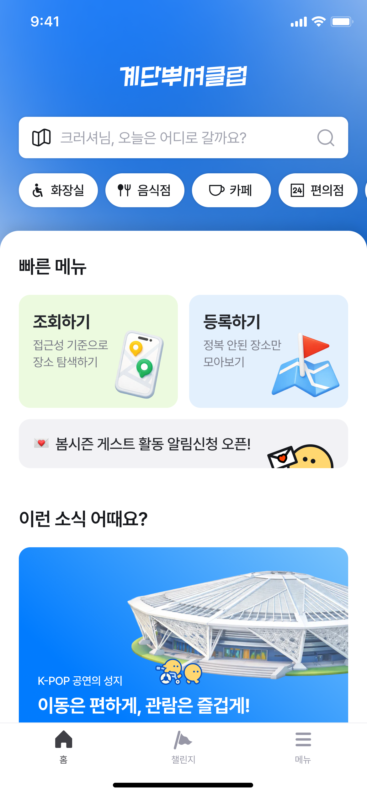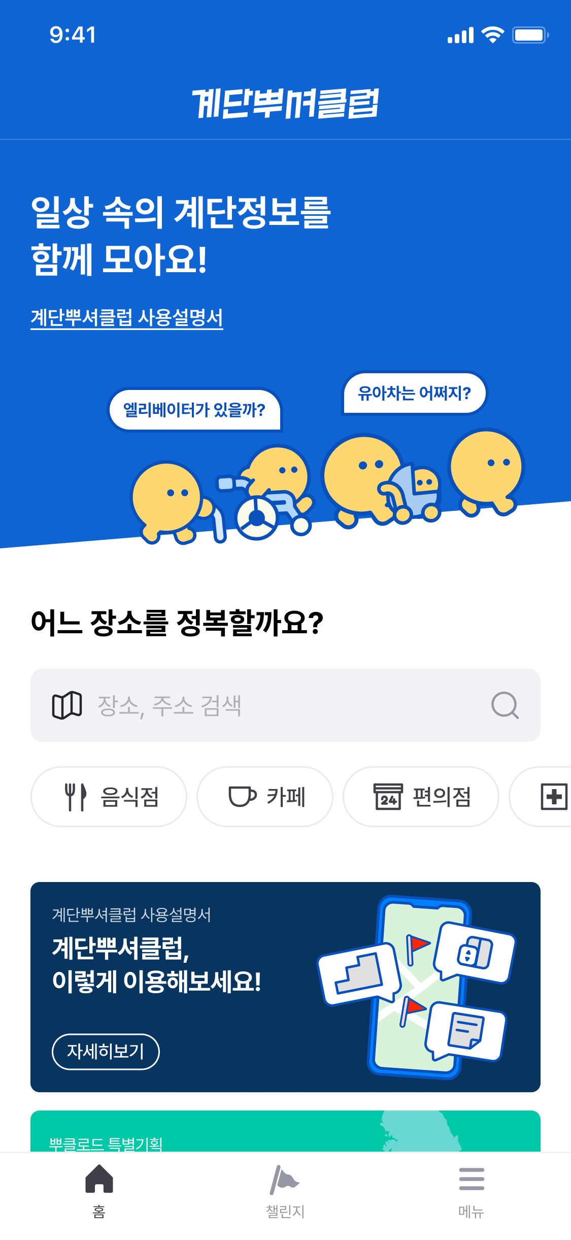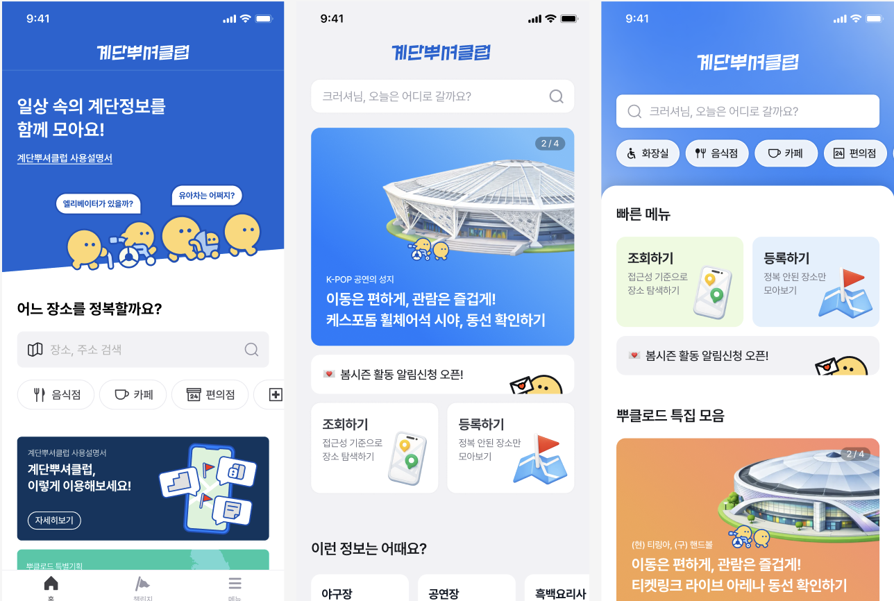 최초의 계단뿌셔클럽 앱은 사실 접근성 정보를 등록하는 사람을 위한 수집 도구로 태어났습니다. 정복활동 나가서 식당 출입구에 턱이 몇 센티인지, 엘리베이터가 있는지 기록하는 도구요. 정보를 등록하는 크루가 곧 사용자였으니까, 과거에는 정보를 조회하는 사람의 관점을 깊이 고민할 이유가 크지 않았어요.