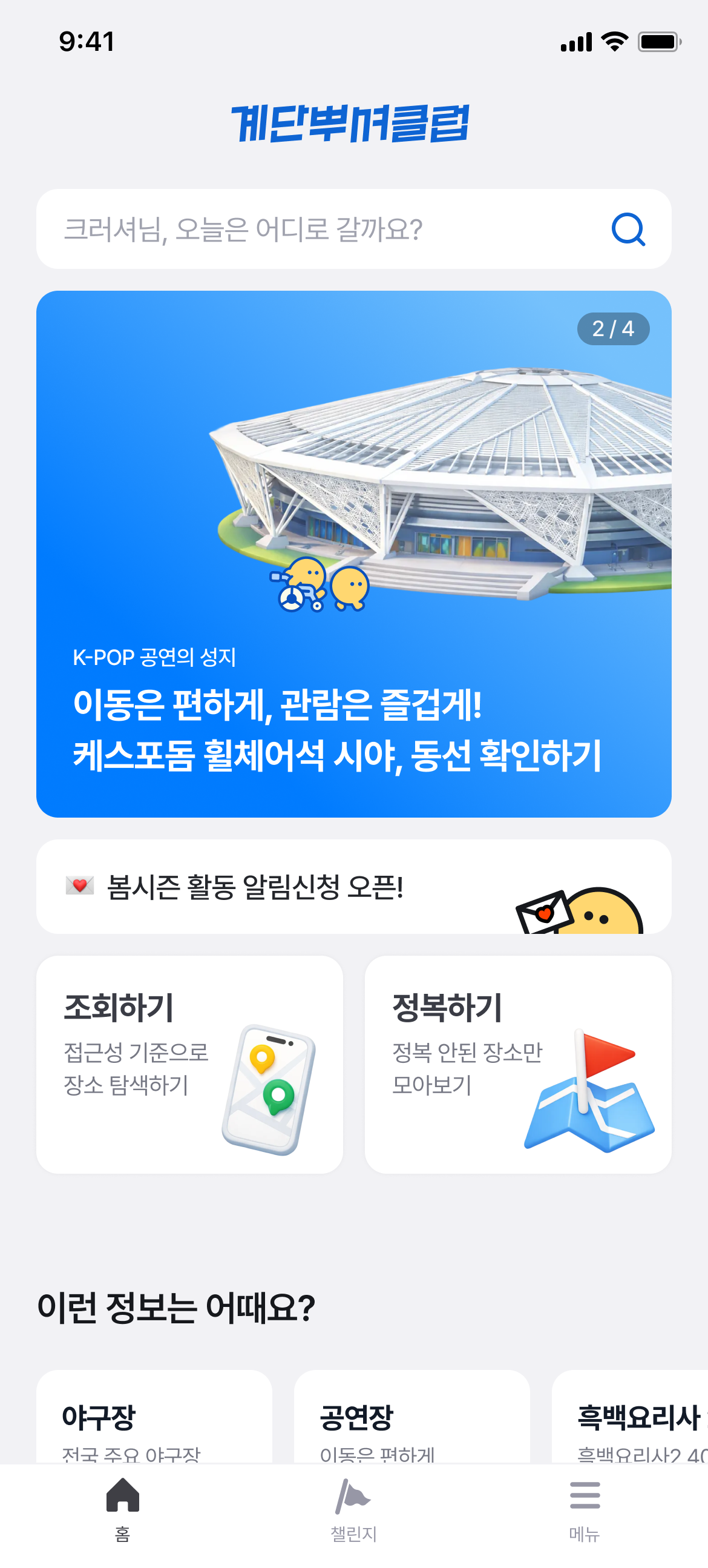배너를 확 키워서 시선을 잡고, 상단에 검색창을 유지하고. 조회하기와 정복하기(등록)를 나누되, 디자인상 더 안정감 있는 위치에 두었어요. 그럴 듯한 앱이 된 것 같았어요. 계뿌클의 컨셉을 살려 정복하기라는 단어도 쓰고요. |
